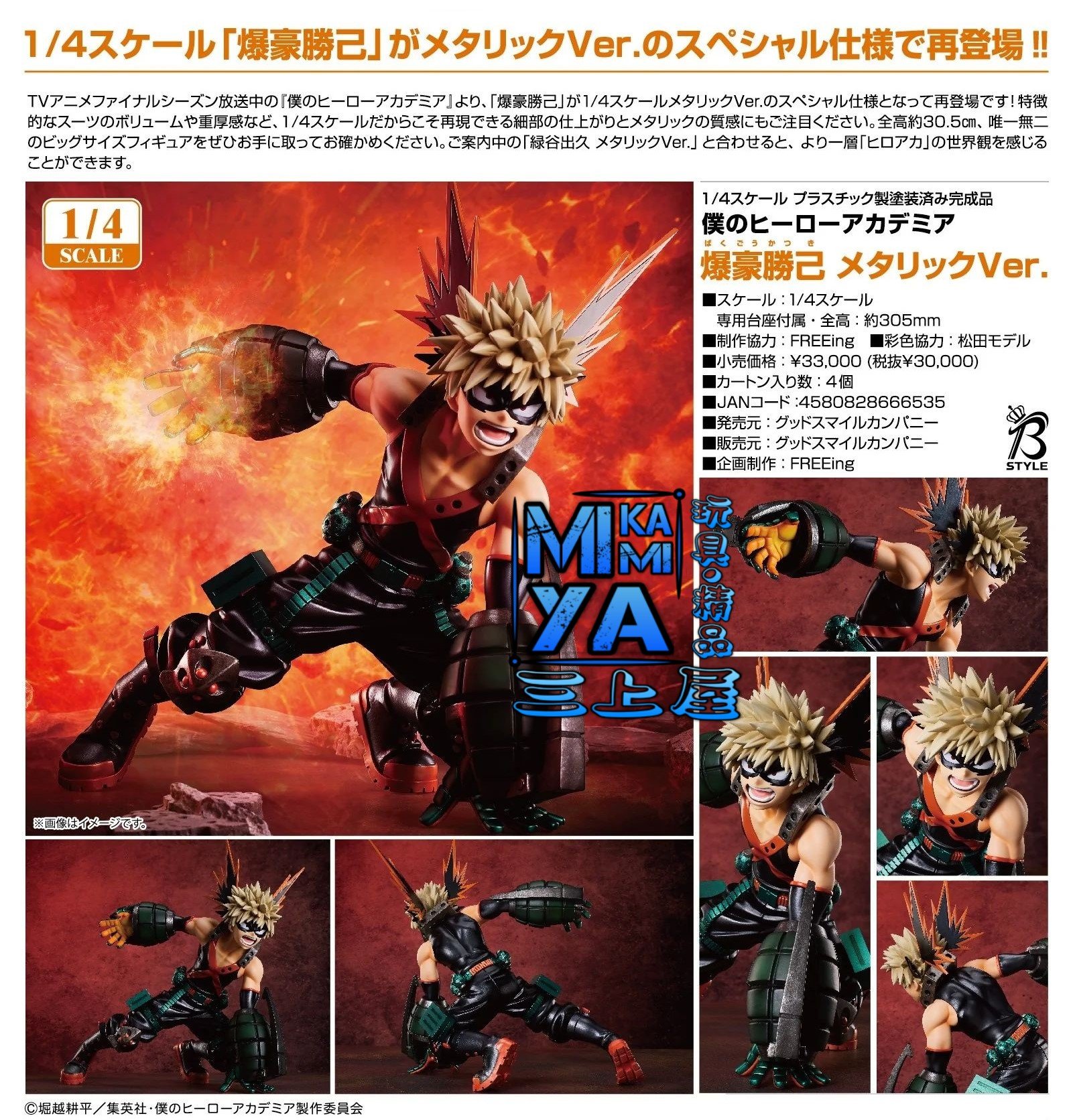 品牌 : Good Smile Company 商品名稱 : 爆豪勝己 金屬Ver. 日語原文 : 爆豪勝己 メタリックVer. - 僕のヒーローアカデミア 比例 : 1/4 素材 : ABS・PVC 塗裝完成品 作品 : 我的英雄學院 價格 : HKD$1748 [訂金 : HKD$650] 予約截訂日 : 12/12/2025 予定發售期 : 2026年5月予定 #4580828666535 1/4比例「爆豪勝己」的金屬Ver.以特別樣式再次登場!! 出自最終季正於日本播放中的電視動畫《我的英雄學院》,「爆豪勝己」以1/4比例模型金屬Ver.的特別樣式再次登場!具特徵性的套裝份量和厚重感等,唯有1/4比例才能重現的細節完成度及金屬質感,十分引人注目。全高約30.5公分,將獨一無二的大尺寸模型帶回家親自鑑賞吧。搭配開放預購中的「綠谷出久 金屬Ver.」一同擺飾,能更加感受「我的英雄學院」的世界觀。 ================================ MIKAMIYA三上屋預訂商品條款: 客人預訂將視作接受下列注意事項。 1)圖片為製造商提供資料,有機會與實際商品有些許差異。 2)預訂貨品售價以本店發出的單據上貨品價格為準。 3)本店會使用Whatsapp向訂貨客人發出電子單據及到貨通知,如需使用其他方式請於預訂時主動提出。 4)客人收到取貨通知後請於指定期限內到本店門市取貨,或聯絡本店安排送貨[順豐速運(運費自付)]。 ※如客人有困難未能於取貨期限內到店,請主動向本店聯絡支付尾數及申請延長取貨期限至指定日期。 ※本店可以[順豐速運(運費自付)]方式郵寄到香港/澳門及其他地區,本店怒不承擔運輸過程的風險。 ※香港/澳門以外地區可能會產生海關方面的問題或額外關稅,請收貨方自行處理。 5)本店發出取貨通知提示後會起計取貨期限,如超出取貨期限仍未到店取貨及未有聯絡本店,本店會正式視作客人取消訂單及撻訂處理。 6)客人有義務檢查取貨通知信息,本店恕不承擔因客人逾期取貨所造成的損失。 7)本店會盡量與代理商協調返貨數量再公開預訂商品,如因供應商中止生產或臨時限制出貨數量,本店會安排訂金全額退還。 8)所有"日版"商品沒有售後服務,並不設退換。 9)部份"行版/代理版"發行商會提供有限期售後服務,如出現瑕疵或缺件可向本店職員查詢安排轉介至發行商或總代理,本店不提供直接退貨或換貨。 10)商品有機會出現延遲出貨的情況,發售日及各項資訊以製造商官方網站為準,請留意相關官方公佈。 11)如有出現因錯字或發行商提供錯誤資料導致商品資訊或價格出現異常,本店有機會聯絡客人安排更正/取消錯誤訂單,如未能達成共識,已收取之款項將會全數退還。 ================================