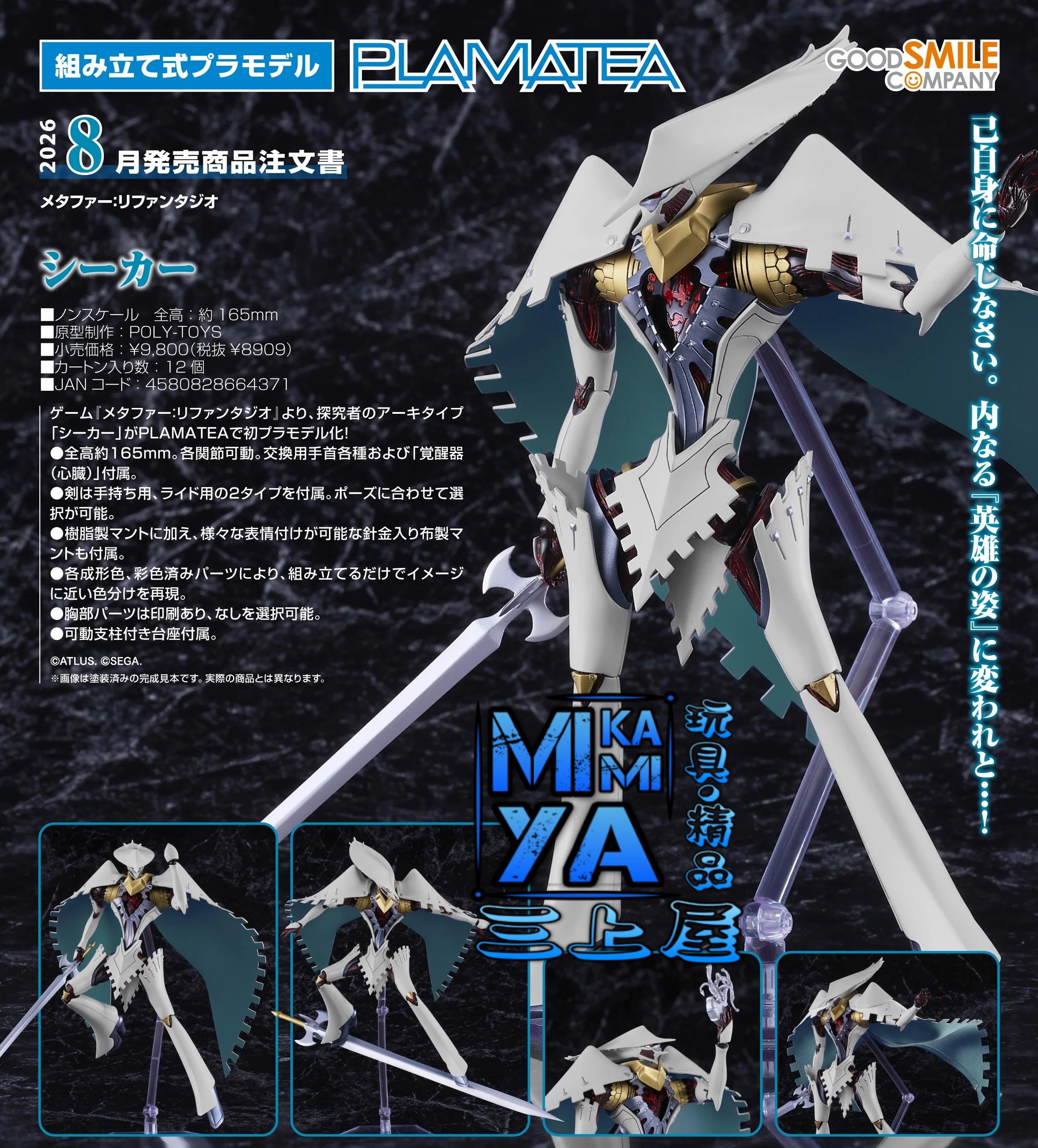品牌 : Good Smile Company 商品名稱 : PLAMATEA Seeker 日語原文 : PLAMATEA シーカー - メタファー:リファンタジオ 比例 : non 素材 : 組裝式塑膠模型 作品 : 暗喻幻想:ReFantazio 價格 : HKD$438 [訂金 : HKD$150] 予約截訂日 : 13/2/2026 予定發售期 : 2026年8月予定 #4580828664371 命令你自己吧。要變成內在「英雄的模樣」……! 出自遊戲《暗喻幻想:ReFantazio》,探究者的阿基態「Seeker」於PLAMATEA首次化身為組裝模型! ・全高約165mm。各關節為可動式設計。附各種替換用手掌和「覺醒器(心臟)」。 ・附手拿專用和騎乘專用2種型態的劍。可搭配姿勢進行選擇。 ・除了樹脂製的披風外,還附含有鐵絲的布製披風,可呈現多種表情。 ・搭配各成型色及上色完成零件,組裝起來便能重現其近似劇中的樣貌。 ・可選擇有、無印刷的胸部零件。 ・商品包含附可動支架的台座。 ================================ MIKAMIYA三上屋預訂商品條款: 客人預訂將視作接受下列注意事項。 1)圖片為製造商提供資料,有機會與實際商品有些許差異。 2)預訂貨品售價以本店發出的單據上貨品價格為準。 3)本店會使用Whatsapp向訂貨客人發出電子單據及到貨通知,如需使用其他方式請於預訂時主動提出。 4)客人收到取貨通知後請於指定期限內到本店門市取貨,或聯絡本店安排送貨[順豐速運(運費自付)]。 ※如客人有困難未能於取貨期限內到店,請主動向本店聯絡支付尾數及申請延長取貨期限至指定日期。 ※本店可以[順豐速運(運費自付)]方式郵寄到香港/澳門及其他地區,本店怒不承擔運輸過程的風險。 ※香港/澳門以外地區可能會產生海關方面的問題或額外關稅,請收貨方自行處理。 5)本店發出取貨通知提示後會起計取貨期限,如超出取貨期限仍未到店取貨及未有聯絡本店,本店會正式視作客人取消訂單及撻訂處理。 6)客人有義務檢查取貨通知信息,本店恕不承擔因客人逾期取貨所造成的損失。 7)本店會盡量與代理商協調返貨數量再公開預訂商品,如因供應商中止生產或臨時限制出貨數量,本店會安排訂金全額退還。 8)所有"日版"商品沒有售後服務,並不設退換。 9)部份"行版/代理版"發行商會提供有限期售後服務,如出現瑕疵或缺件可向本店職員查詢安排轉介至發行商或總代理,本店不提供直接退貨或換貨。 10)商品有機會出現延遲出貨的情況,發售日及各項資訊以製造商官方網站為準,請留意相關官方公佈。 11)如有出現因錯字或發行商提供錯誤資料導致商品資訊或價格出現異常,本店有機會聯絡客人安排更正/取消錯誤訂單,如未能達成共識,已收取之款項將會全數退還。 ================================