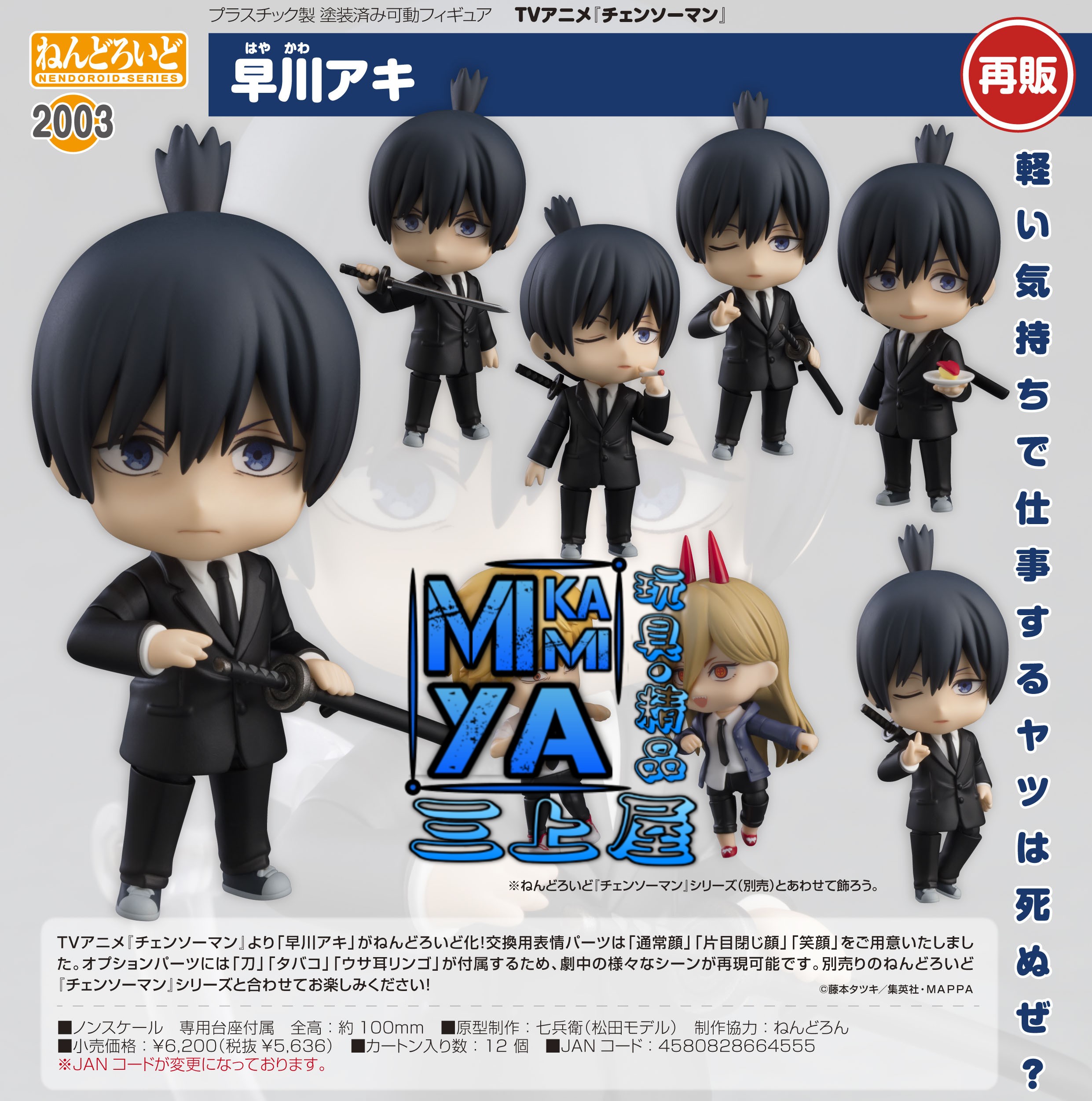 品牌 : Good Smile Company 商品名稱 : 黏土人 2003 早川秋 日語原文 : ねんどろいど 早川アキ - チェンソーマン 素材 : ABS・PVC 塗裝完成品 作品 : 鏈鋸人 價格 : HKD$288 [訂金 : HKD$100] 予約截訂日 : 14/11/2025 予定發售期 : 2026年2月予定 #4580828664555 抱著輕浮態度工作的傢伙可是會死的。 出自電視動畫《鏈鋸人》,「早川秋」化身為黏土人!替換用表情零件有「普通臉」、「閉上單眼臉」與「笑臉」。配件有「刀」、「香菸」及「兔子蘋果」,可重現劇中的各種場景。將他帶回家搭配另售的黏土人《鏈鋸人》系列一同賞玩吧! ================================ MIKAMIYA三上屋預訂商品條款: 客人預訂將視作接受下列注意事項。 1)圖片為製造商提供資料,有機會與實際商品有些許差異。 2)預訂貨品售價以本店發出的單據上貨品價格為準。 3)本店會使用Whatsapp向訂貨客人發出電子單據及到貨通知,如需使用其他方式請於預訂時主動提出。 4)客人收到取貨通知後請於指定期限內到本店門市取貨,或聯絡本店安排送貨[順豐速運(運費自付)]。 ※如客人有困難未能於取貨期限內到店,請主動向本店聯絡支付尾數及申請延長取貨期限至指定日期。 ※本店可以[順豐速運(運費自付)]方式郵寄到香港/澳門及其他地區,本店怒不承擔運輸過程的風險。 ※香港/澳門以外地區可能會產生海關方面的問題或額外關稅,請收貨方自行處理。 5)本店發出取貨通知提示後會起計取貨期限,如超出取貨期限仍未到店取貨及未有聯絡本店,本店會正式視作客人取消訂單及撻訂處理。 6)客人有義務檢查取貨通知信息,本店恕不承擔因客人逾期取貨所造成的損失。 7)本店會盡量與代理商協調返貨數量再公開預訂商品,如因供應商中止生產或臨時限制出貨數量,本店會安排訂金全額退還。 8)所有"日版"商品沒有售後服務,並不設退換。 9)部份"行版/代理版"發行商會提供有限期售後服務,如出現瑕疵或缺件可向本店職員查詢安排轉介至發行商或總代理,本店不提供直接退貨或換貨。 10)商品有機會出現延遲出貨的情況,發售日及各項資訊以製造商官方網站為準,請留意相關官方公佈。 11)如有出現因錯字或發行商提供錯誤資料導致商品資訊或價格出現異常,本店有機會聯絡客人安排更正/取消錯誤訂單,如未能達成共識,已收取之款項將會全數退還。 ================================