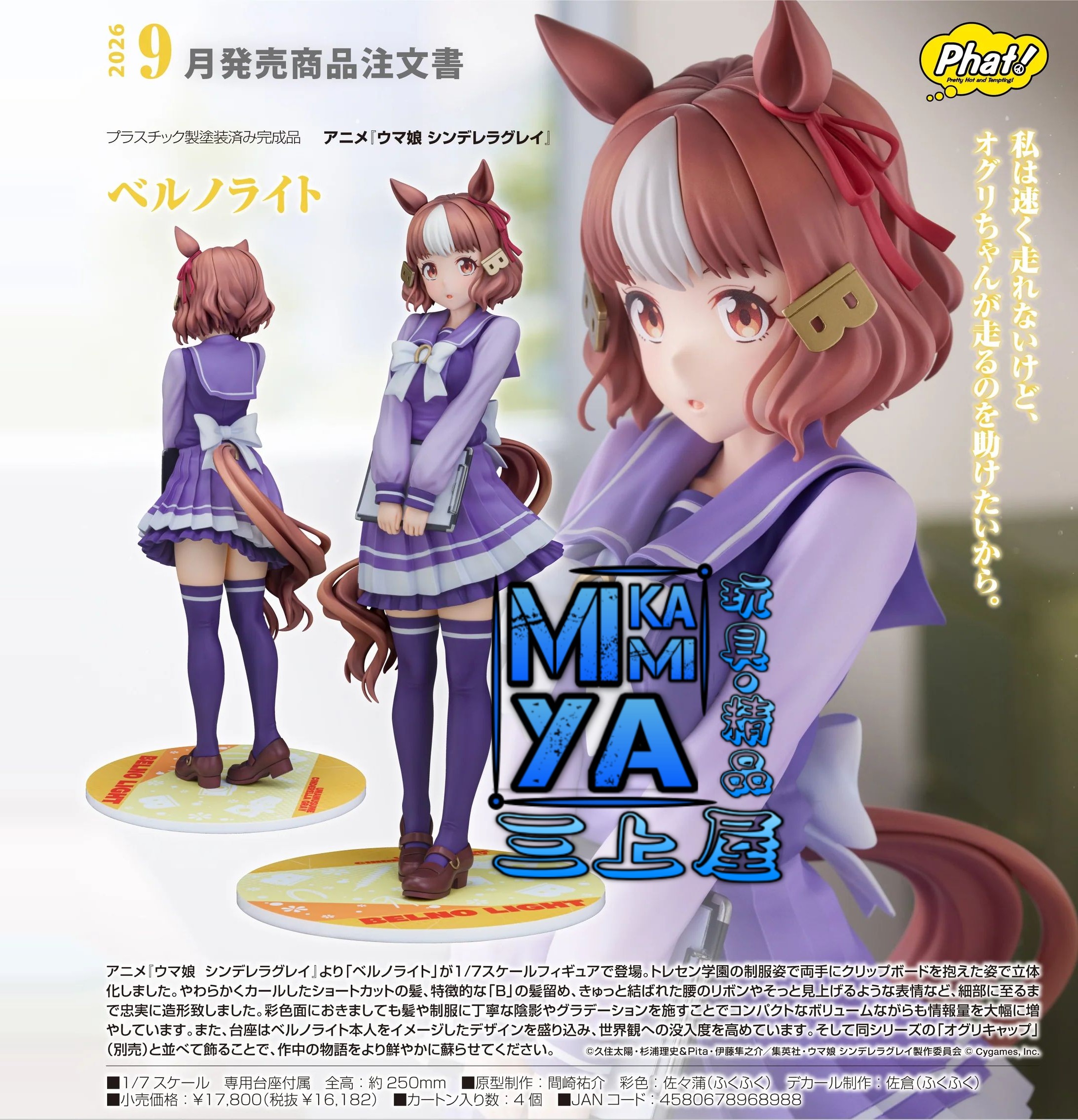 品牌 : Phat ! Company 商品名稱 : 雙鈴萊特 日語原文 : ウマ娘 シンデレラグレイ ベルノライト 比例 : 1/7 素材 : ABS・PVC 塗裝完成品 作品 : 賽馬娘 PrettyDerby / 賽馬娘 灰髮灰姑娘 價格 : HKD$898 [訂金 : HKD$300] 予約截訂日 : 14/11/2025 予定發售期 : 2026年9月予定 #4580678968988 雖然我跑不快,但我想幫助小栗奔跑。 出自《賽馬娘 灰髮灰姑娘》,「雙鈴萊特」化身為1/7比例模型登場。將特雷森學園制服姿態,雙手抱著資料夾板的造型製成模型。柔軟捲曲的短髮、具特徵性的「B」字髮夾、繫在腰間上的蝴蝶結和輕柔仰望的表情等,每個細節都忠實造型製作。在色彩方面,對頭髮與制服施以細緻的陰影和漸層效果,雖外型精巧卻大幅增加了資訊量。另外,台座融入了雙鈴萊特本人的形象設計,提升對世界觀的沉浸感。與同系列的「小栗帽」(另售)一同擺飾,能讓作品中的故事更加鮮明地重現。 ================================ MIKAMIYA三上屋預訂商品條款: 客人預訂將視作接受下列注意事項。 1)圖片為製造商提供資料,有機會與實際商品有些許差異。 2)預訂貨品售價以本店發出的單據上貨品價格為準。 3)本店會使用Whatsapp向訂貨客人發出電子單據及到貨通知,如需使用其他方式請於預訂時主動提出。 4)客人收到取貨通知後請於指定期限內到本店門市取貨,或聯絡本店安排送貨[順豐速運(運費自付)]。 ※如客人有困難未能於取貨期限內到店,請主動向本店聯絡支付尾數及申請延長取貨期限至指定日期。 ※本店可以[順豐速運(運費自付)]方式郵寄到香港/澳門及其他地區,本店怒不承擔運輸過程的風險。 ※香港/澳門以外地區可能會產生海關方面的問題或額外關稅,請收貨方自行處理。 5)本店發出取貨通知提示後會起計取貨期限,如超出取貨期限仍未到店取貨及未有聯絡本店,本店會正式視作客人取消訂單及撻訂處理。 6)客人有義務檢查取貨通知信息,本店恕不承擔因客人逾期取貨所造成的損失。 7)本店會盡量與代理商協調返貨數量再公開預訂商品,如因供應商中止生產或臨時限制出貨數量,本店會安排訂金全額退還。 8)所有"日版"商品沒有售後服務,並不設退換。 9)部份"行版/代理版"發行商會提供有限期售後服務,如出現瑕疵或缺件可向本店職員查詢安排轉介至發行商或總代理,本店不提供直接退貨或換貨。 10)商品有機會出現延遲出貨的情況,發售日及各項資訊以製造商官方網站為準,請留意相關官方公佈。 11)如有出現因錯字或發行商提供錯誤資料導致商品資訊或價格出現異常,本店有機會聯絡客人安排更正/取消錯誤訂單,如未能達成共識,已收取之款項將會全數退還。 ================================