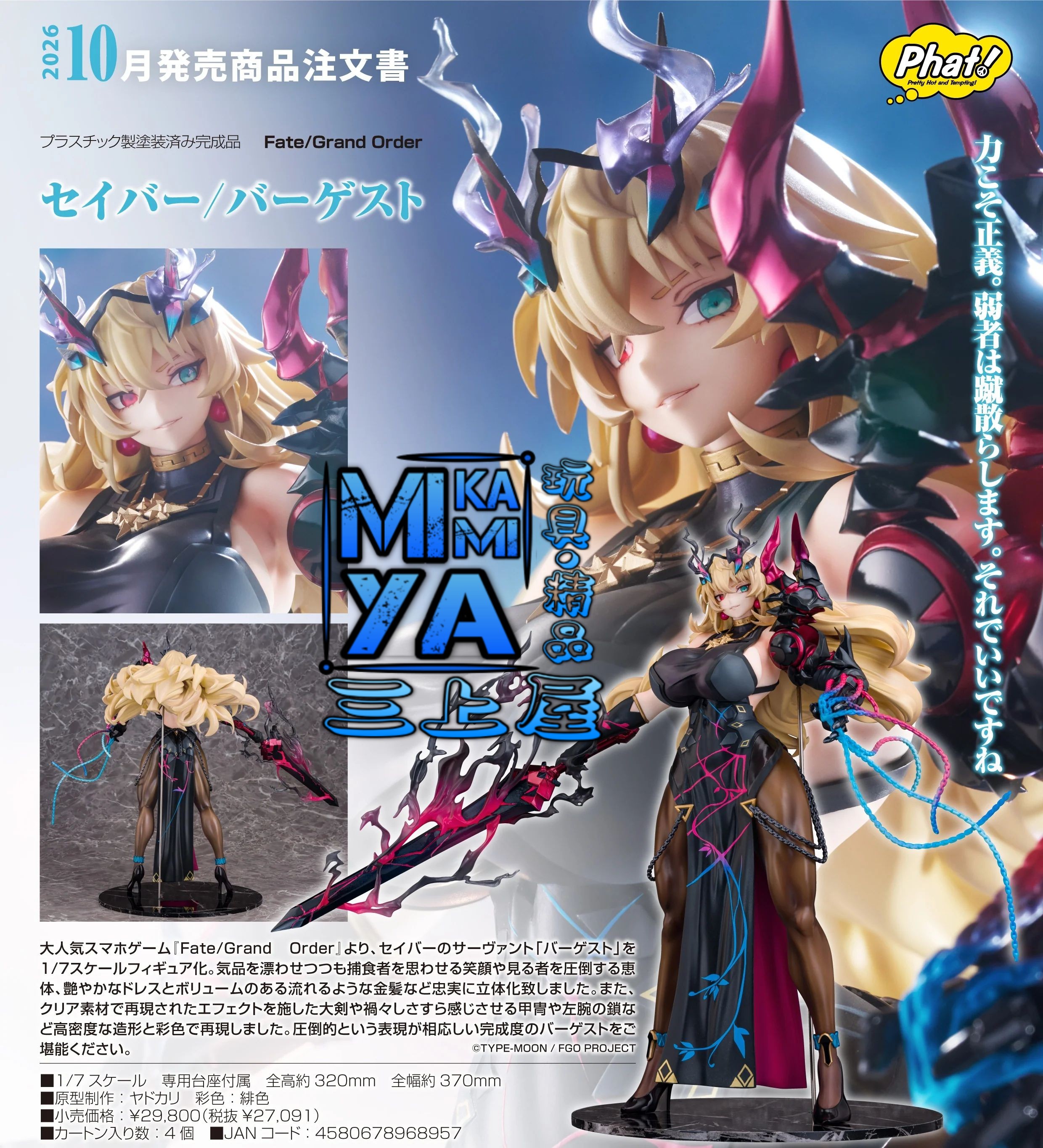 品牌 : Phat! Company 商品名稱 : Saber / 巴格斯特 日語原文 : セイバー/バーゲスト 比例 : 1/7 素材 : ABS・PVC 塗裝完成品 作品 : Fate/Grand Order 價格 : HKD$1368 [訂金 : HKD$450] 予約截訂日 : 16/1/2026 予定發售期 : 2026年10月予定 #4580678968957 力量就是正義。弱者要被驅散。這樣沒問題吧? 出自超人氣手機遊戲《Fate/Grand Order》,Saber從者「巴格斯特」化身為1/7比例模型。散發著高貴氣息卻又帶有掠食者般的笑容、壓倒眾人的豐滿身材、華麗禮服與具分量感的流動金髮等,皆忠實地製成模型。另外,以透明材質重現施以特效的大劍、散發出不詳氣息的鎧甲和左臂的鎖鏈等,以高密度造型與上色完美重現。敬請將堪稱具壓倒性完美之作的巴格斯特帶回家鑑賞吧。 ================================ MIKAMIYA三上屋預訂商品條款: 客人預訂將視作接受下列注意事項。 1)圖片為製造商提供資料,有機會與實際商品有些許差異。 2)預訂貨品售價以本店發出的單據上貨品價格為準。 3)本店會使用Whatsapp向訂貨客人發出電子單據及到貨通知,如需使用其他方式請於預訂時主動提出。 4)客人收到取貨通知後請於指定期限內到本店門市取貨,或聯絡本店安排送貨[順豐速運(運費自付)]。 ※如客人有困難未能於取貨期限內到店,請主動向本店聯絡支付尾數及申請延長取貨期限至指定日期。 ※本店可以[順豐速運(運費自付)]方式郵寄到香港/澳門及其他地區,本店怒不承擔運輸過程的風險。 ※香港/澳門以外地區可能會產生海關方面的問題或額外關稅,請收貨方自行處理。 5)本店發出取貨通知提示後會起計取貨期限,如超出取貨期限仍未到店取貨及未有聯絡本店,本店會正式視作客人取消訂單及撻訂處理。 6)客人有義務檢查取貨通知信息,本店恕不承擔因客人逾期取貨所造成的損失。 7)本店會盡量與代理商協調返貨數量再公開預訂商品,如因供應商中止生產或臨時限制出貨數量,本店會安排訂金全額退還。 8)所有"日版"商品沒有售後服務,並不設退換。 9)部份"行版/代理版"發行商會提供有限期售後服務,如出現瑕疵或缺件可向本店職員查詢安排轉介至發行商或總代理,本店不提供直接退貨或換貨。 10)商品有機會出現延遲出貨的情況,發售日及各項資訊以製造商官方網站為準,請留意相關官方公佈。 11)如有出現因錯字或發行商提供錯誤資料導致商品資訊或價格出現異常,本店有機會聯絡客人安排更正/取消錯誤訂單,如未能達成共識,已收取之款項將會全數退還。 ================================