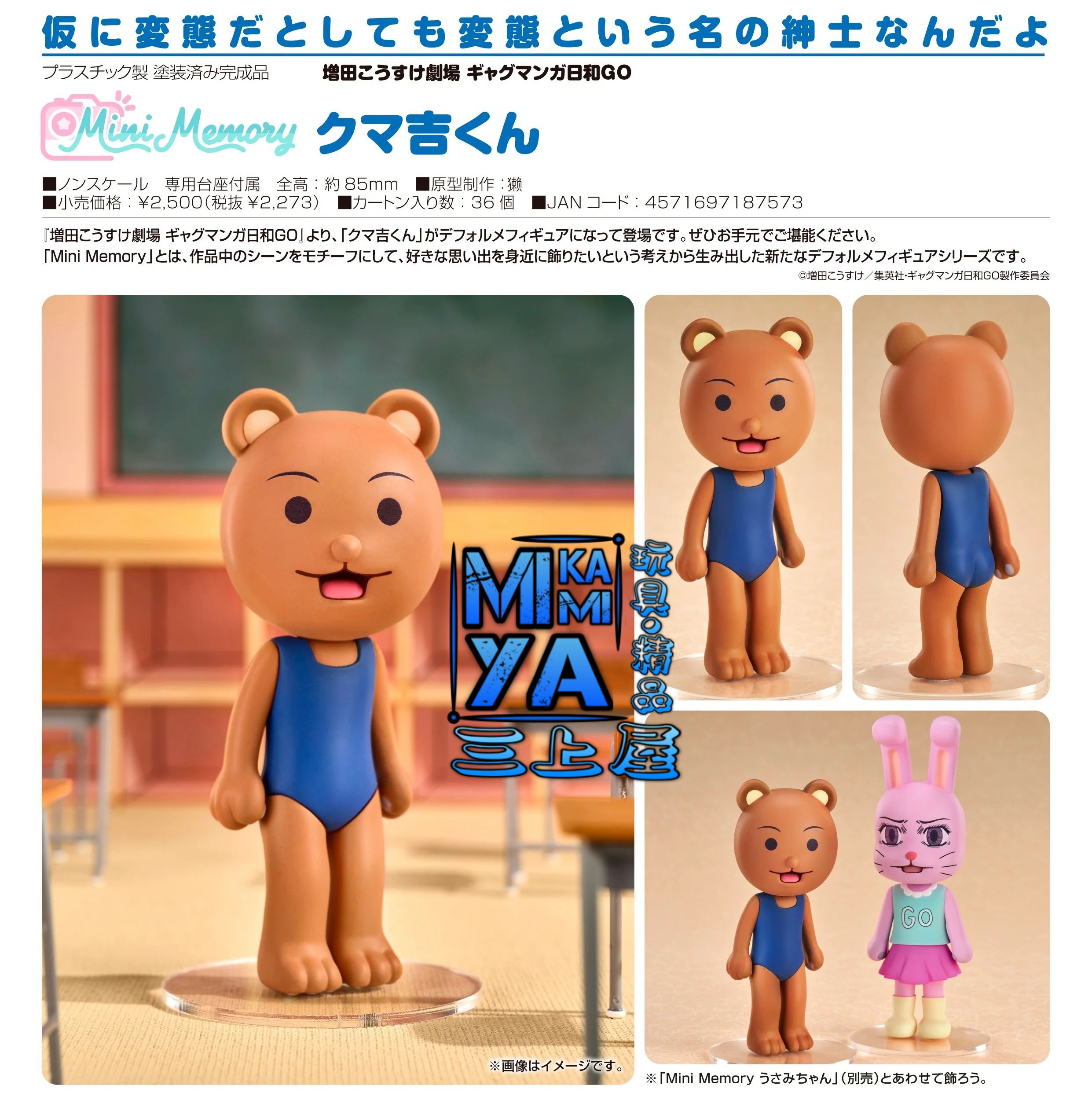 品牌 : Good Smile Arts Shanghai 商品名稱 : Mini Memory 熊吉 日語原文 : Mini Memory クマ吉くん - 増田こうすけ劇場 ギャグマンガ日和GO 比例 : non 素材 : ABS・PVC 塗裝完成品 作品 : 搞笑漫畫日和GO 價格 : HKD$128 [訂金 : HKD$50] 予約截訂日 : 21/11//2025 予定發售期 : 2026年5月予定 #4571697187573 ================================ MIKAMIYA三上屋預訂商品條款: 客人預訂將視作接受下列注意事項。 1)圖片為製造商提供資料,有機會與實際商品有些許差異。 2)預訂貨品售價以本店發出的單據上貨品價格為準。 3)本店會使用Whatsapp向訂貨客人發出電子單據及到貨通知,如需使用其他方式請於預訂時主動提出。 4)客人收到取貨通知後請於指定期限內到本店門市取貨,或聯絡本店安排送貨[順豐速運(運費自付)]。 ※如客人有困難未能於取貨期限內到店,請主動向本店聯絡支付尾數及申請延長取貨期限至指定日期。 ※本店可以[順豐速運(運費自付)]方式郵寄到香港/澳門及其他地區,本店怒不承擔運輸過程的風險。 ※香港/澳門以外地區可能會產生海關方面的問題或額外關稅,請收貨方自行處理。 5)本店發出取貨通知提示後會起計取貨期限,如超出取貨期限仍未到店取貨及未有聯絡本店,本店會正式視作客人取消訂單及撻訂處理。 6)客人有義務檢查取貨通知信息,本店恕不承擔因客人逾期取貨所造成的損失。 7)本店會盡量與代理商協調返貨數量再公開預訂商品,如因供應商中止生產或臨時限制出貨數量,本店會安排訂金全額退還。 8)所有"日版"商品沒有售後服務,並不設退換。 9)部份"行版/代理版"發行商會提供有限期售後服務,如出現瑕疵或缺件可向本店職員查詢安排轉介至發行商或總代理,本店不提供直接退貨或換貨。 10)商品有機會出現延遲出貨的情況,發售日及各項資訊以製造商官方網站為準,請留意相關官方公佈。 11)如有出現因錯字或發行商提供錯誤資料導致商品資訊或價格出現異常,本店有機會聯絡客人安排更正/取消錯誤訂單,如未能達成共識,已收取之款項將會全數退還。 ================================