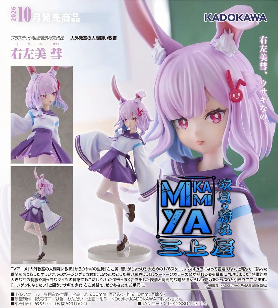 出自電視動畫《非人學生與厭世教師》,兔子學生「右左美慧」化身為稍大一點的1/6比例模型登場!捕捉輕盈跳躍的瞬間為靈感,以原創姿勢製成模型。細膩重現蓬鬆柔軟的長耳、尾巴和雙色調頭髮的搖擺姿勢。具有特徵性的大袖設計制服與雪白褲襪的質感也相當講究,調皮露出舌頭的表情和挑逗的雙眼,完美襯托出她獨有的魅力。許願「立志要成為人類」的兔子少女·右左美慧,敬請帶回家鑑賞吧。