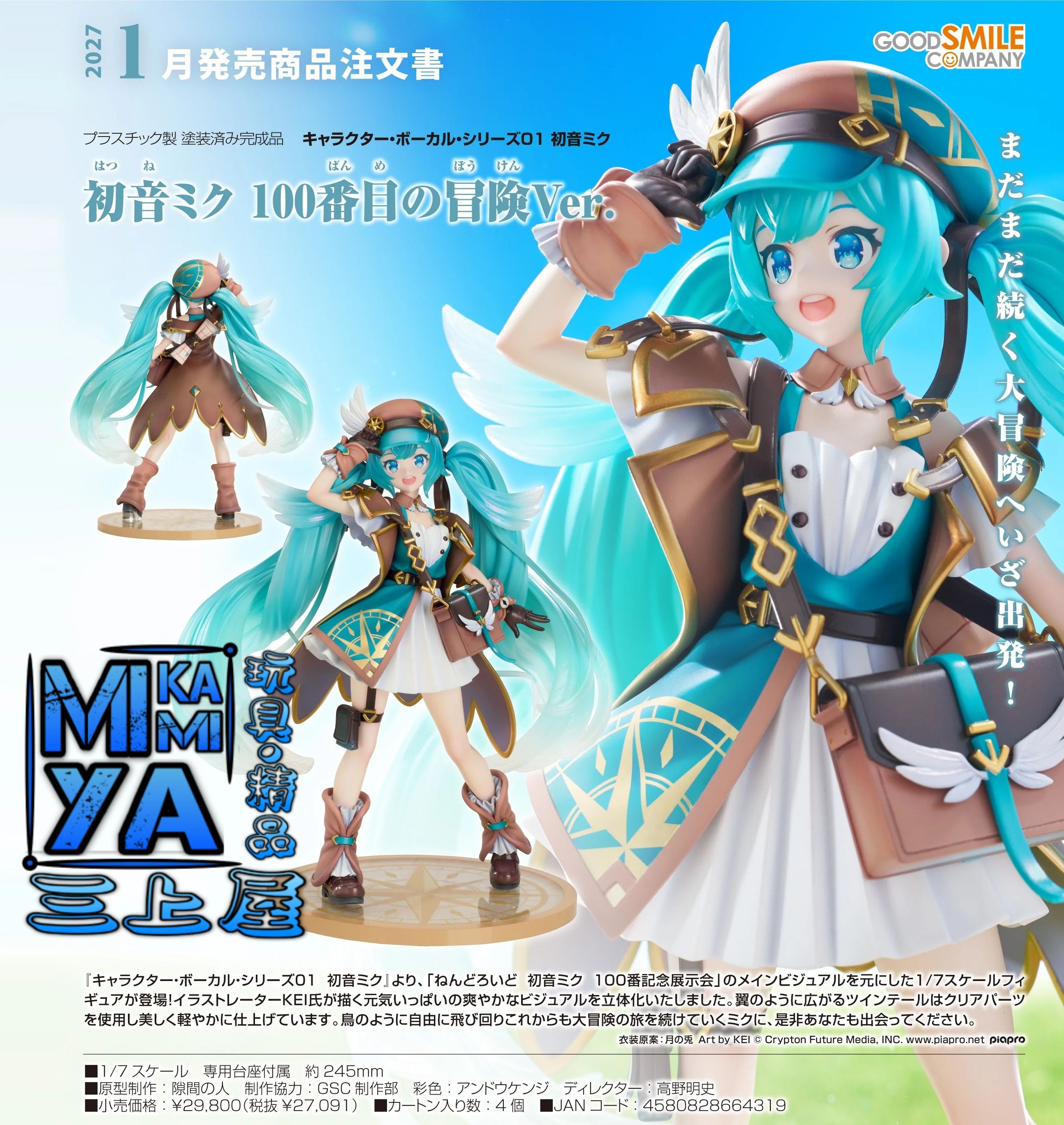 品牌 : Good Smile Company 商品名稱 : 初音未來 第100次的冒險Ver. 日語原文 : 初音ミク 100番目の冒険Ver. 比例 : 1/7 素材 : ABS・PVC 塗裝完成品 作品 : Character Vocal系列01 初音未來 價格 : HKD$1348 [訂金 : HKD$450] 予約截訂日 : 6/2/2026 予定發售期 : 2027年1月予定 #4580828664319 大冒險持續中,現在就出發吧! 出自《Character Vocal系列01 初音未來》,以「黏土人 初音未來 第100號紀念展」主視覺為原型的1/7比例模型登場!將插畫家KEI所繪製充滿活力的清爽視覺製成模型。如翅膀般展開的雙馬尾使用透明零件,打造出美麗而輕盈的效果。敬請與像鳥一般自由飛翔,持續展開大冒險之旅的初音相遇吧。 ================================ MIKAMIYA三上屋預訂商品條款: 客人預訂將視作接受下列注意事項。 1)圖片為製造商提供資料,有機會與實際商品有些許差異。 2)預訂貨品售價以本店發出的單據上貨品價格為準。 3)本店會使用Whatsapp向訂貨客人發出電子單據及到貨通知,如需使用其他方式請於預訂時主動提出。 4)客人收到取貨通知後請於指定期限內到本店門市取貨,或聯絡本店安排送貨[順豐速運(運費自付)]。 ※如客人有困難未能於取貨期限內到店,請主動向本店聯絡支付尾數及申請延長取貨期限至指定日期。 ※本店可以[順豐速運(運費自付)]方式郵寄到香港/澳門及其他地區,本店怒不承擔運輸過程的風險。 ※香港/澳門以外地區可能會產生海關方面的問題或額外關稅,請收貨方自行處理。 5)本店發出取貨通知提示後會起計取貨期限,如超出取貨期限仍未到店取貨及未有聯絡本店,本店會正式視作客人取消訂單及撻訂處理。 6)客人有義務檢查取貨通知信息,本店恕不承擔因客人逾期取貨所造成的損失。 7)本店會盡量與代理商協調返貨數量再公開預訂商品,如因供應商中止生產或臨時限制出貨數量,本店會安排訂金全額退還。 8)所有"日版"商品沒有售後服務,並不設退換。 9)部份"行版/代理版"發行商會提供有限期售後服務,如出現瑕疵或缺件可向本店職員查詢安排轉介至發行商或總代理,本店不提供直接退貨或換貨。 10)商品有機會出現延遲出貨的情況,發售日及各項資訊以製造商官方網站為準,請留意相關官方公佈。 11)如有出現因錯字或發行商提供錯誤資料導致商品資訊或價格出現異常,本店有機會聯絡客人安排更正/取消錯誤訂單,如未能達成共識,已收取之款項將會全數退還。 ================================