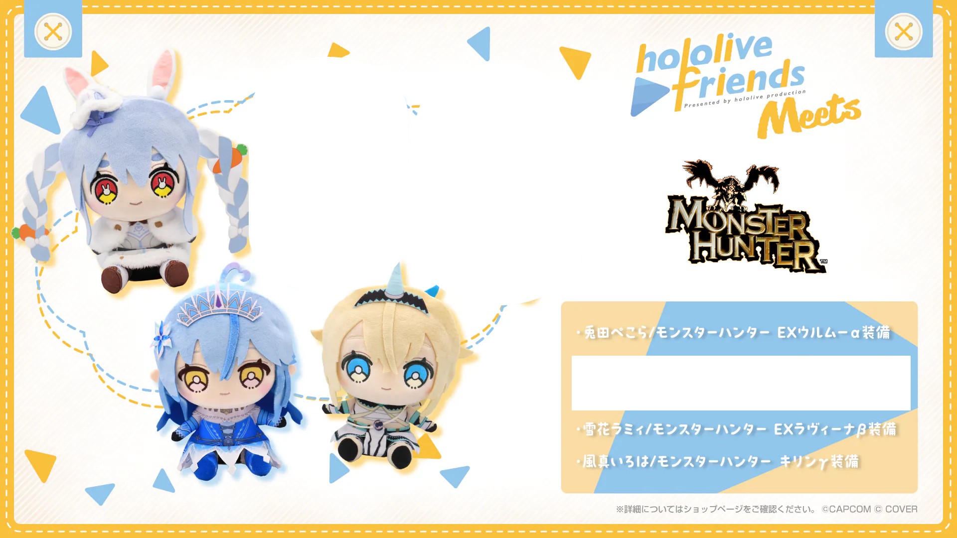 HOLOLIVE FRIENDS MEETS MONSTER HUNTER 魔物獵人 兔田佩克拉 EX 浮空龍α裝 雪花菈米 冰咒龍β裝 風真伊呂波 麒麟γ裝 公仔 毛公仔