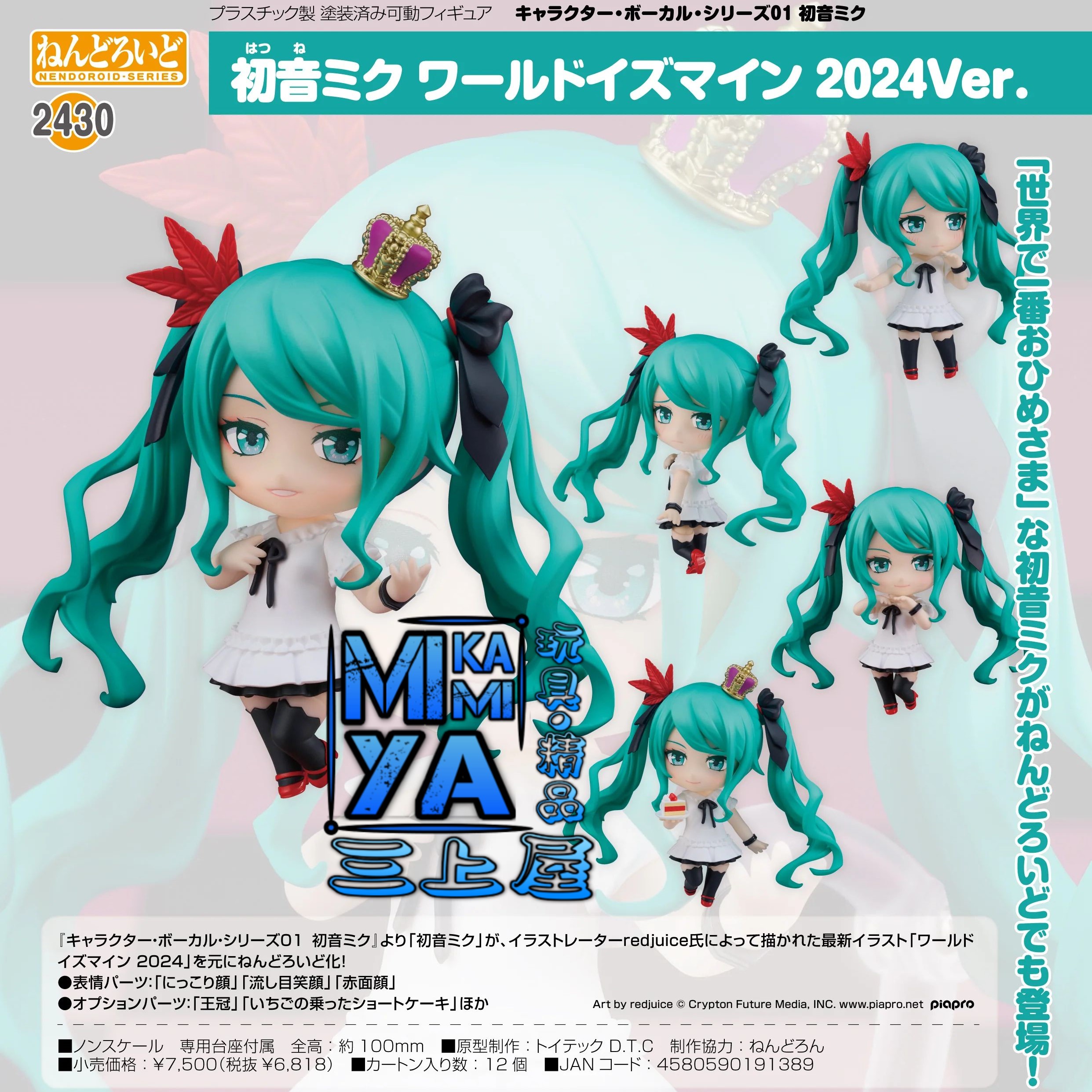 品牌 : Good Smile Company 商品名稱 : 黏土人 2430 初音未來 World is Mine 2024Ver. 比例 : Q版 素材 : ABS・PVC 塗裝完成品 作品 : Character Vocal系列01 初音未來 #4580590191389 「世界第一公主殿下」的初音未來化身為黏土人登場! 出自《Character Vocal系列01 初音未來》,「初音未來」以繪師redjuice所繪製的最新插畫「World is Mine 2024」為原圖化身為黏土人。 ・表情零件:「開心笑臉」、「瞇眼笑臉」、「臉頰發紅臉」 ・配件:「王冠」、「草莓蛋糕」等。 ================================ ================================ ================================ ================================ ================================ ================================ ================================ ================================ 商品相關 : 三上屋 日本玩具 手辦 人偶 模型 奸笑社 好微笑 好奸笑 GoodSmileCompany 迷你公仔 GoodSmile Good Smile Company GSC PVC FIGURE GS ねんどろいど 娃娃 土偶 黏土人 2430 初音未來 World is Mine 2024Ver. Character Vocal系列01 初 音 未 來 Nendoroid no.2430 Hatsune Miku - World Is Mine 2024 Ver. 初音 未來 世界で一番おひめさま ねんどろいど初音ミク ワールドイズマイン 2024Ver. 初音ミク 初音 ミク ねんどろいど2430 黏土人2430 Nendoroid2430 黏土人初音未來 黏土人未來 黏土人初音 WorldisMine WorldisMine2024 世界第一公主殿下 世界第一公主大人 電子天使 機械天使 公主 歌姬 虛擬偶像